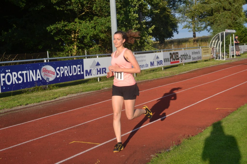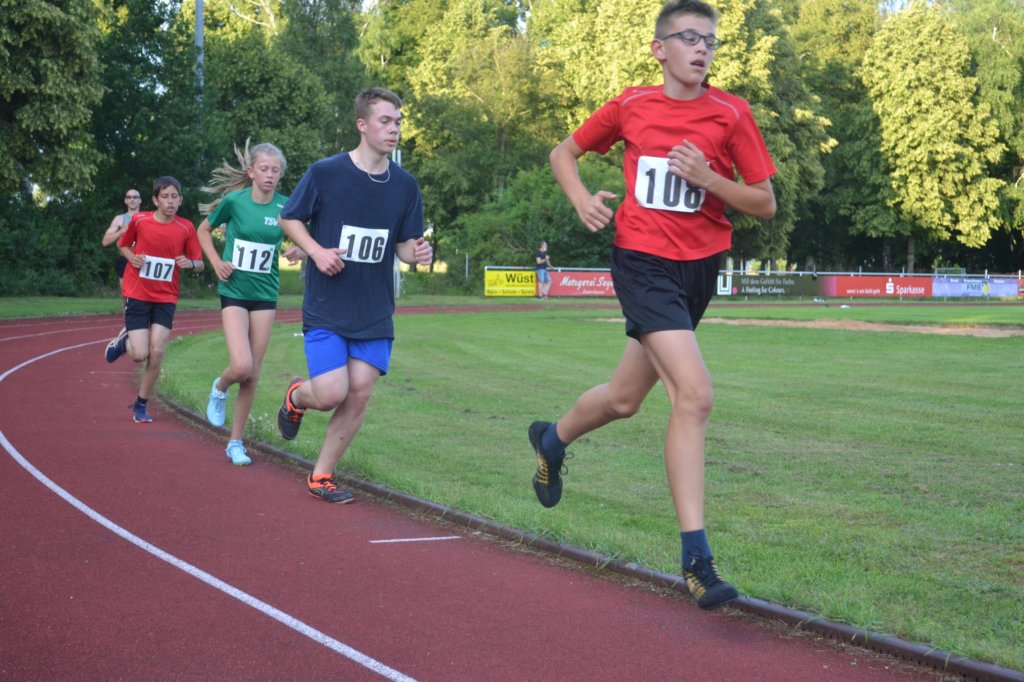 Ein Pacemaker sorgte auf den ersten beiden Runden für Tempo, nach zwei Runden konnte ihn aber nur noch Lokalmatador Simon Bauer (TV Leutershausen) folgen. Die Entscheidung im Kampf um die ersten vier Plätze war damit auch gefallen. Sinon Bauer meldete sich als Gesamtsieger mit einer Zeit von 9:11,71 min ins Wettkampfgeschehen zurück. Der siebzehnjährige Steve Wolf (LG Gäu Athletics) sicherte sich nach 9:40,21 min und Matthias Ries (Herrieder Aquathleten) verfehle als Gesamtdritter in 10:02,76 min nur knapp die Zehnminuten -Marke. Marlene Schmidt (TV Leutershausen) lief ebenfalls ein einsames Rennen und finishte nach 11:46,76 min auf Rang Vier. Nach einem sehr gleichmäßigen Rennen freute sich Moritz Braun (TSV Ansbach) bei seinem ersten 3000er über eine Zeit von 12:40,92 min. Seine Vereinskollegin Lara Baumann lief lange Zeit in einer Gruppe und konnte sich am Ende etwas absetzen. Mit einer Zeit von 12:51,24 min unterbot sie knapp ihre zwei Wochen alte Bestmarke. Paul Schaudi führte die Phalanx von fünf TVL-Läufern an und unterbot in seinem ersten 3000m-Rennen mit 12:58,92 min knapp die 13-Minuten-Marke. Es folgten Matthias Naser, Jan Weber, Sebastian Schlereth und Gerhard Bauer und manch einer war der Meinung, dass er sich am Anfang zu einem zu hohem Tempo verleiten ließ (3.000m Bericht von Jörg Behrendt)